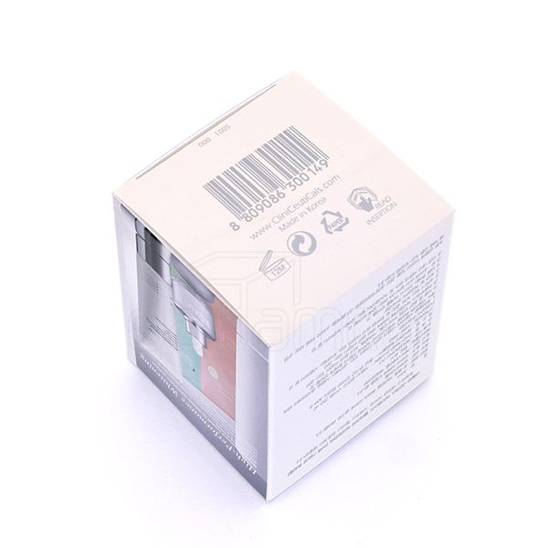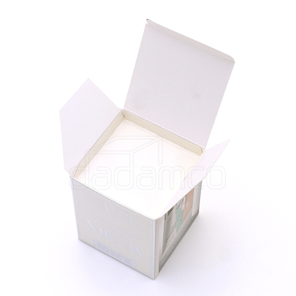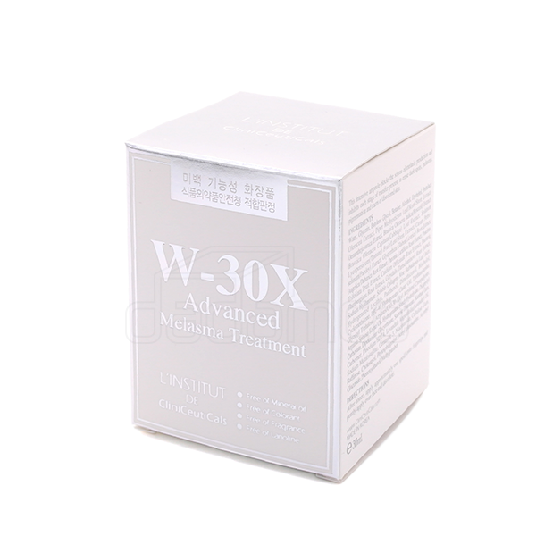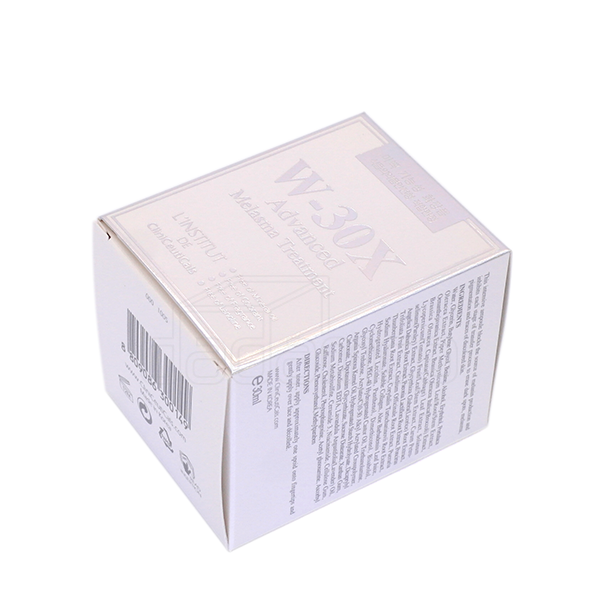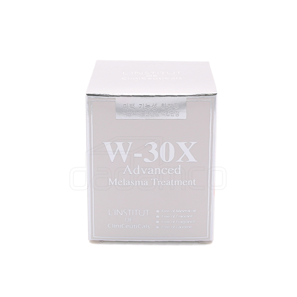 더블유-30엑스 업체명 유니버샬코스메틱 분류 단상자 사양 CCP 350g, 4도 인쇄, 유광 라미네이팅, 은박, 맞뚜껑 단상자 특징 코팅광택을 살리기 위해 써멀코팅, 통은박 내부 지지대 포함