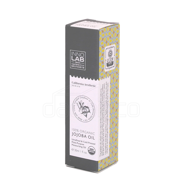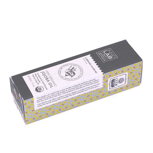 이노랩 호호바오일 30ml 업체명 이노코스마 오가닉스 분류 단상자 사양 RIV 350g, 4도 인쇄, 무광 라미네이팅, 은박, 맞뚜껑 단상자 특징 직립 거치를 위해 하단부 특수 가공 처리 되었습니다.