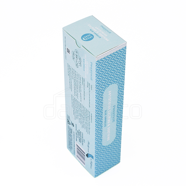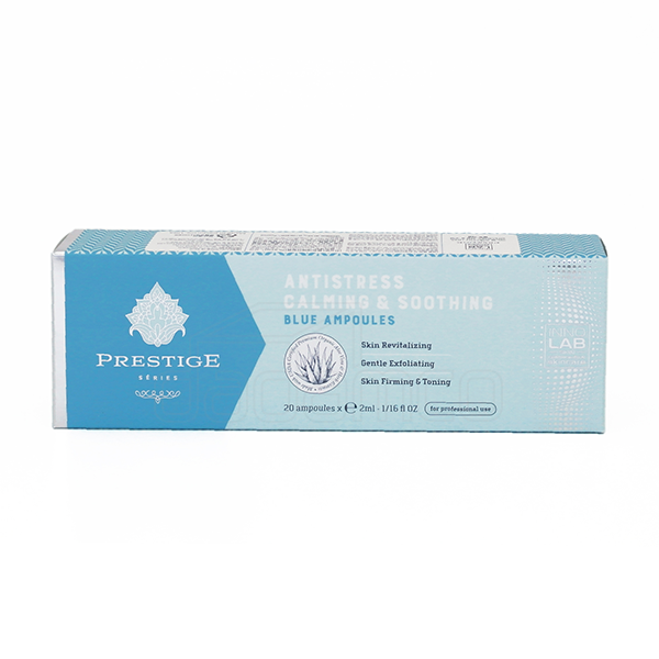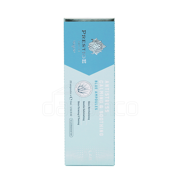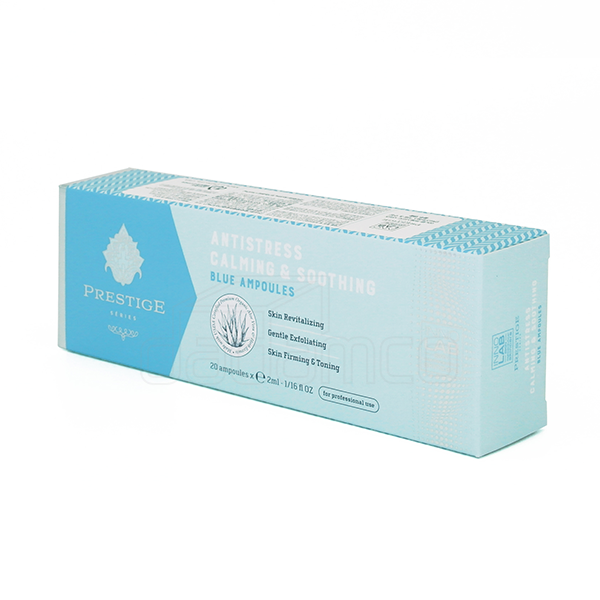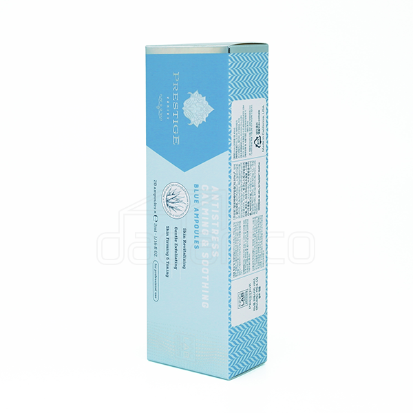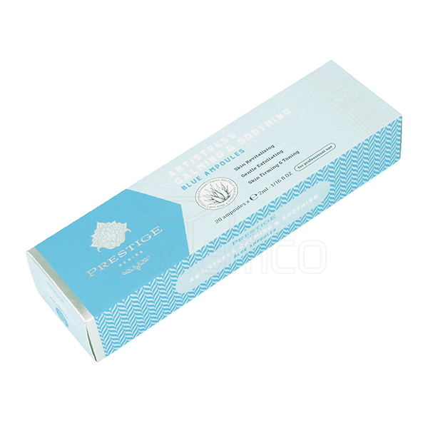 프레스티지 블루 앰플박스 (구형) 업체명 이노코스마 오가닉스 분류 단상자 사양 RIV 400g, 3도 별색인쇄, 무광 라미네이팅, 은박, 맞뚜껑 단상자 특징 앰플 포장용 종이 성형물 2개 내장